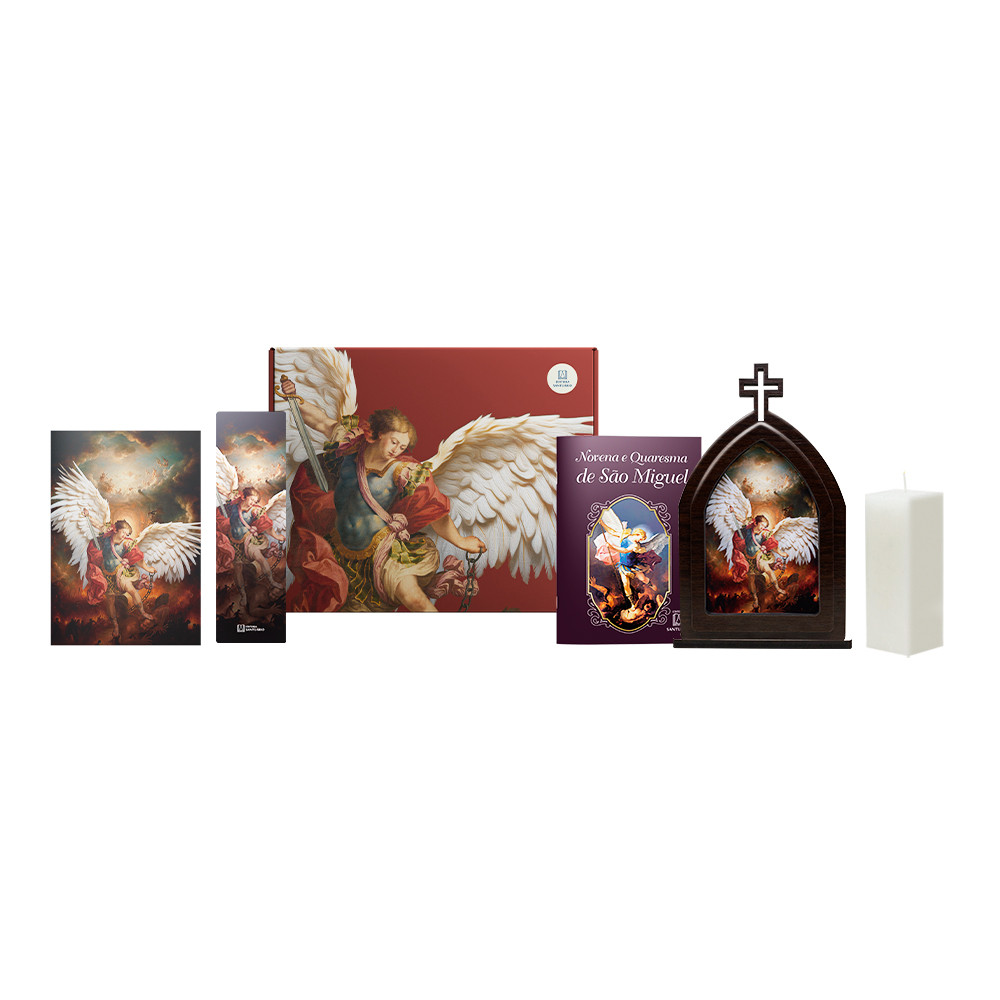 Ideal para você que irá rezar a Quaresma de São Miguel. O kit traz as orações de todos os dias da Quaresma, a capela com a imagem e a vela.